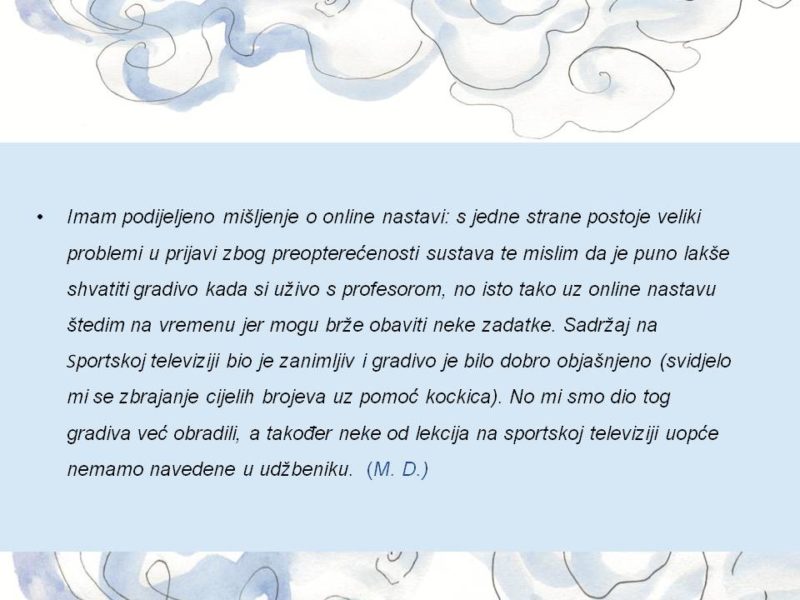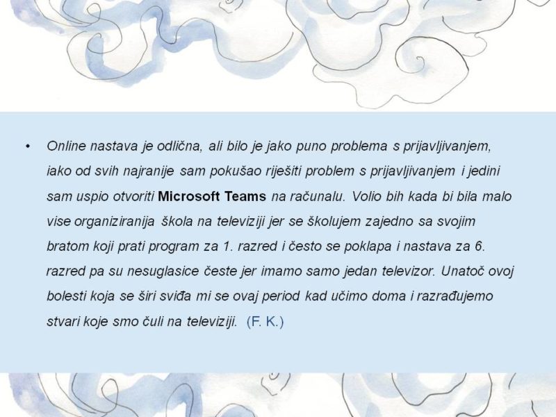 Istina, mnogima se i sviđa online nastava, čini im se zgodnim u pidžami učiti futur prvi i futur drugi (iako su to već sa svojom profesoricom obradili), ali svjesni smo da takvo stanje ne može dugo potrajati. Kao što rekoše moji šestaši u prvim reakcijama na školu online 16. ožujka: