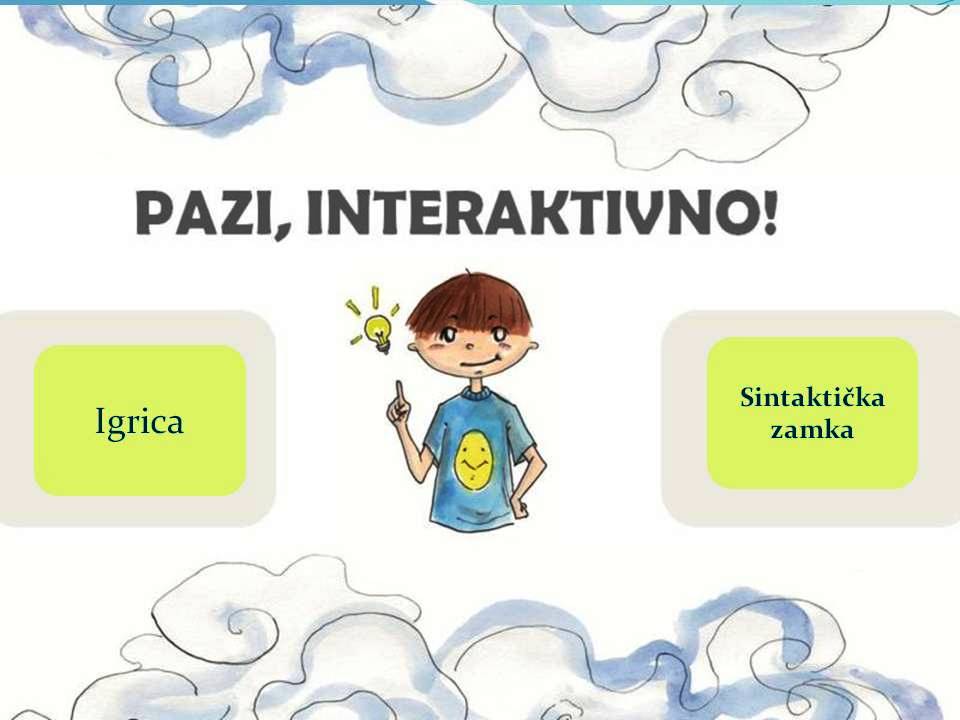 Preporuka je da djeci damo malo više igriva sadržaja, pa eto, u skladu s tim, donosimo vam igru izrađena u wordwall.netu, a obuhvaća znanje sintakse koje su učenici stekli u predmetnoj nastavi (jednostavna rečenica, službe riječi, prepoznavanje objekata i dr.). Napomena: zvuk koji igricu prati dosta je glasan pa prilagodite uporabu svojim i učeničkim potrebama.
